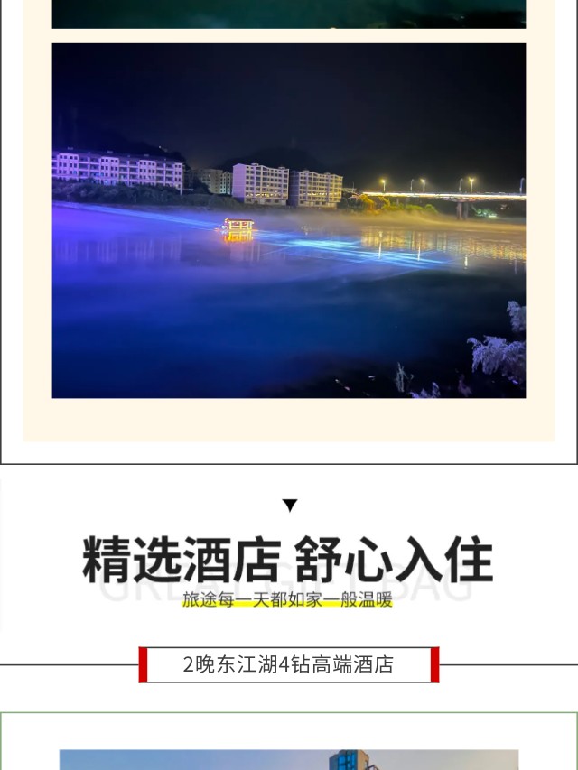 早晨享用早餐后前往【東江湖景區】參觀中華奇觀霧漫小東江散步小東江觀霧棧,之后乘車前往東江大壩旅游碼頭。東江湖湖面面積160平方公里,湖面煙波浩淼,平均水深51米,深處達157米,蓄水量高達81.2億立方米,相當的于半個洞庭湖大,因此被譽為“湘南洞庭”,數十個島嶼星羅其中,被稱為“東方瑞士”之后前往【龍景峽谷景區,峽谷內有堪稱南國最大的瀑布群--龍景十八瀑;是國內的天然氧吧!是我國目前瀑布密集的景區,有大小瀑布26處,水潭18個,是國內罕見的高負離子區。中午中餐自理,下午可自由前往三湘四水旅游文化街參觀,15點集合乘車前往郴州高鐵站結束行程。